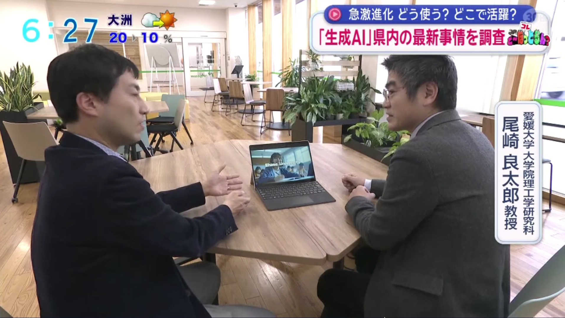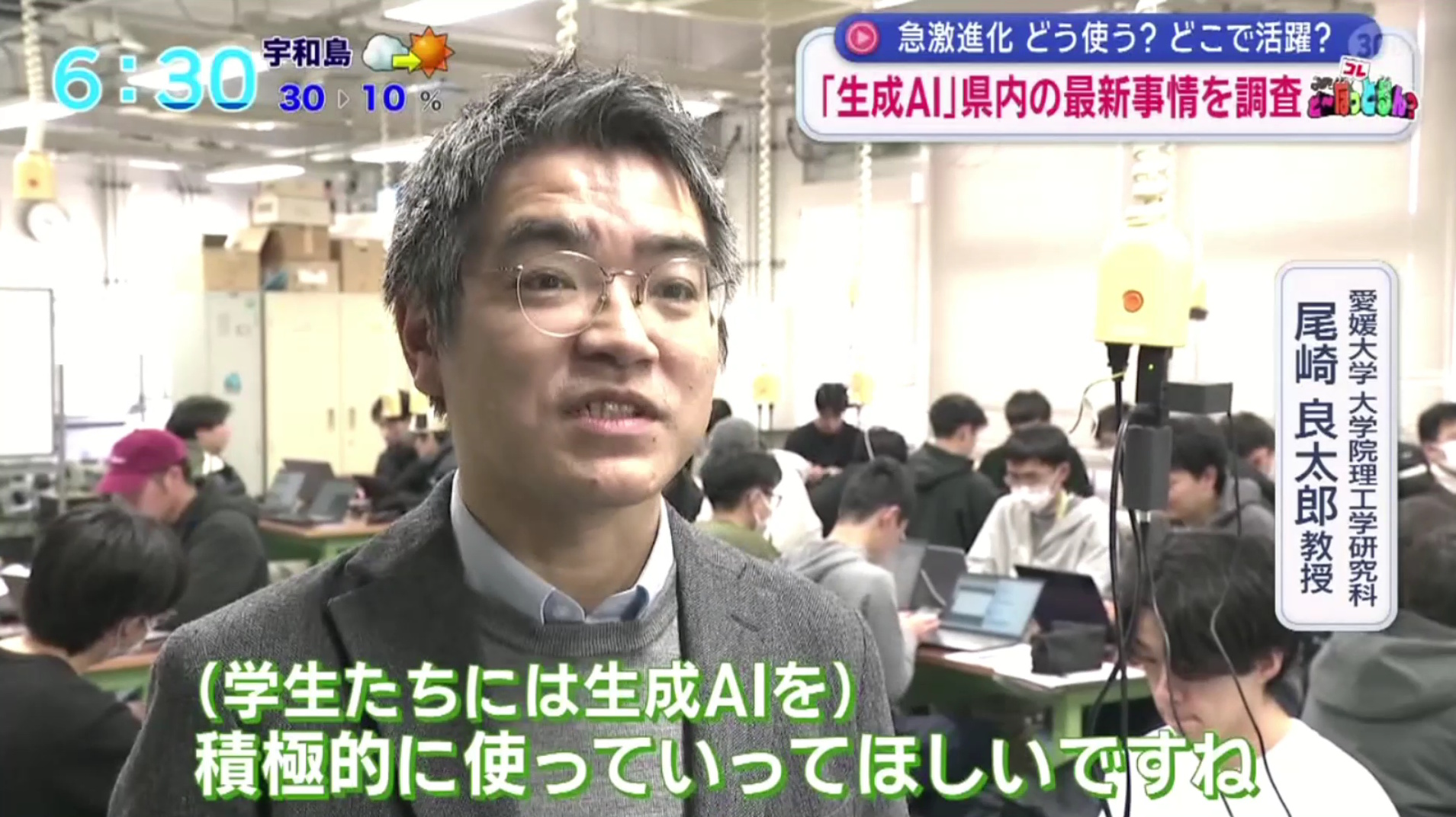 スーパーJチャンネルえひめの「コレど~なっとるん?」というコーナーで、大学での生成AIの取り組みについて取材していただいたものが放映されました。ありがとうございました。